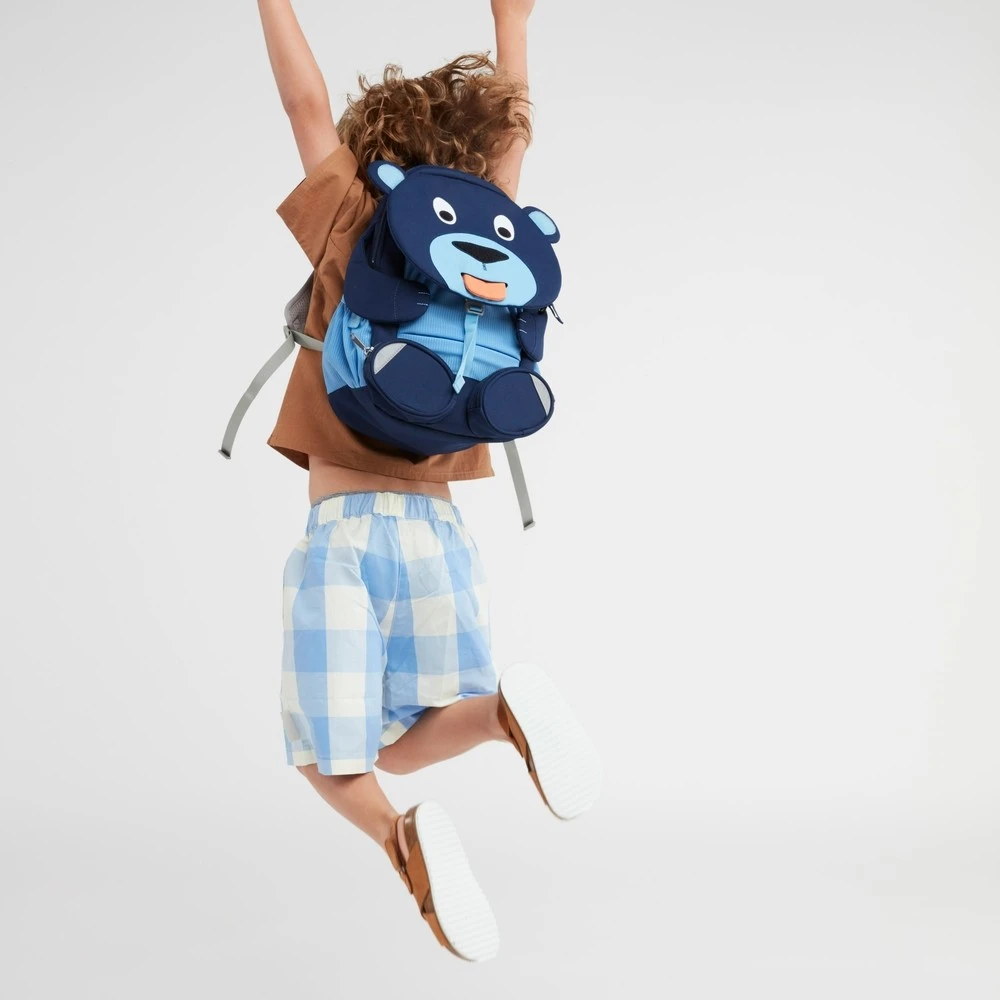 Der hübsche Kindergartenrucksack von Affenzahn ist geeignet für Kinder von ca. 3 – 6 Jahren. In diesem praktischen Rucksack kann Ihr Kind bei Unternehmungen und Ausflügen seine Lieblingssachen mitnehmen. Der Affenzahn Kindergarten-Rucksack hat ein sehr hübsches Design und ergonomische gepolsterte Tragegurte. Im Inneren ist mit einem Volumen von 8 Litern viel Platz für eine Trinkflasche , eine Brotdose und z.B. einer Ersatzhose. Affenzahn Rucksäcke sind ergonomisch, schadstofffrei und nachhaltig : Für die Herstellung des robusten Textilmaterials für diesen Rucksack wurden 6 kleine PET Flaschen (0,5ml) wieder verwertet.