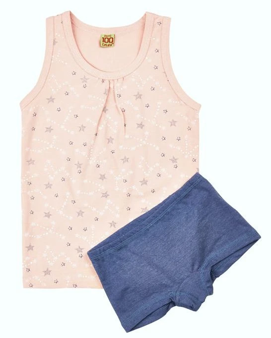 Coole Celavi Unterwäsche mit Sternchen. Süßes Sternchen-Design in mädchenhaften Farben . Die hochwertige Celavi Mädchen-Unterwäsche von CeLaVi ist apricot mit Sternchen-Print. Die Unterhose ist jeansblau, hat eine modische Panty-Form und das Unterhemd hat einen Rundhalsausschnitt.