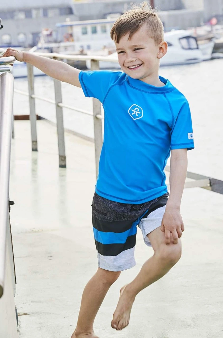 Dehnbares Kinder UV Schutz T-Shirt in ultra blue. Das hochwertige Funktionsmaterial ist schnell trocknend und hat einen UV Schutzfaktor von 50+. Das atmungsaktive Kurzarm Schwimmshirt aus Mikrofaser schützt Kinder beim Schwimmen, Baden und Spielen am Strand vor zu starker Sonneneinstrahlung. Perfekt für den Sommerurlaub am Strand und für die Flugreise ans Meer.