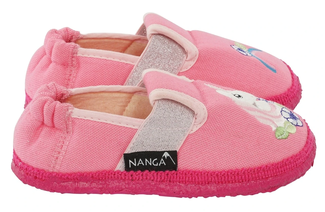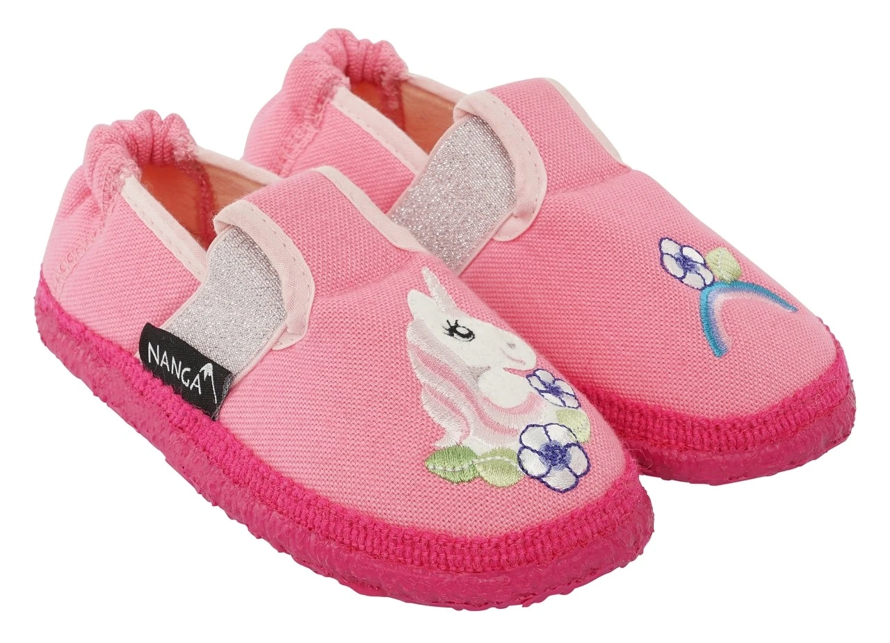 Süße Einhorn Hausschuhe für Mädchen. Für die Herstellung von Nanga Hausschuhen werden nur 100% natürliche Materialien wie reine Bio-Baumwolle und Naturkautschuk verwendet. Der Latexüberzug der Laufsohle geht oben ca. 2 cm über den Sohlenrand. Das schützt den Baumwollstoff vor Nässe. Die schönen Hausschuhe werden nicht gleich nass, wenn Ihr Kind im Kindergarten mal durch eine Wasserpfütze im Waschraum oder nach draußen läuft. Nanga Hausschuhe bieten einen extrem hohen Tragekomfort und ein angenehmes Barfußgefühl. Nanga ist verdienter Sieger in Öko-Test 04/2016 und steht für tolle Hausschuhe in Bio-Qualität!