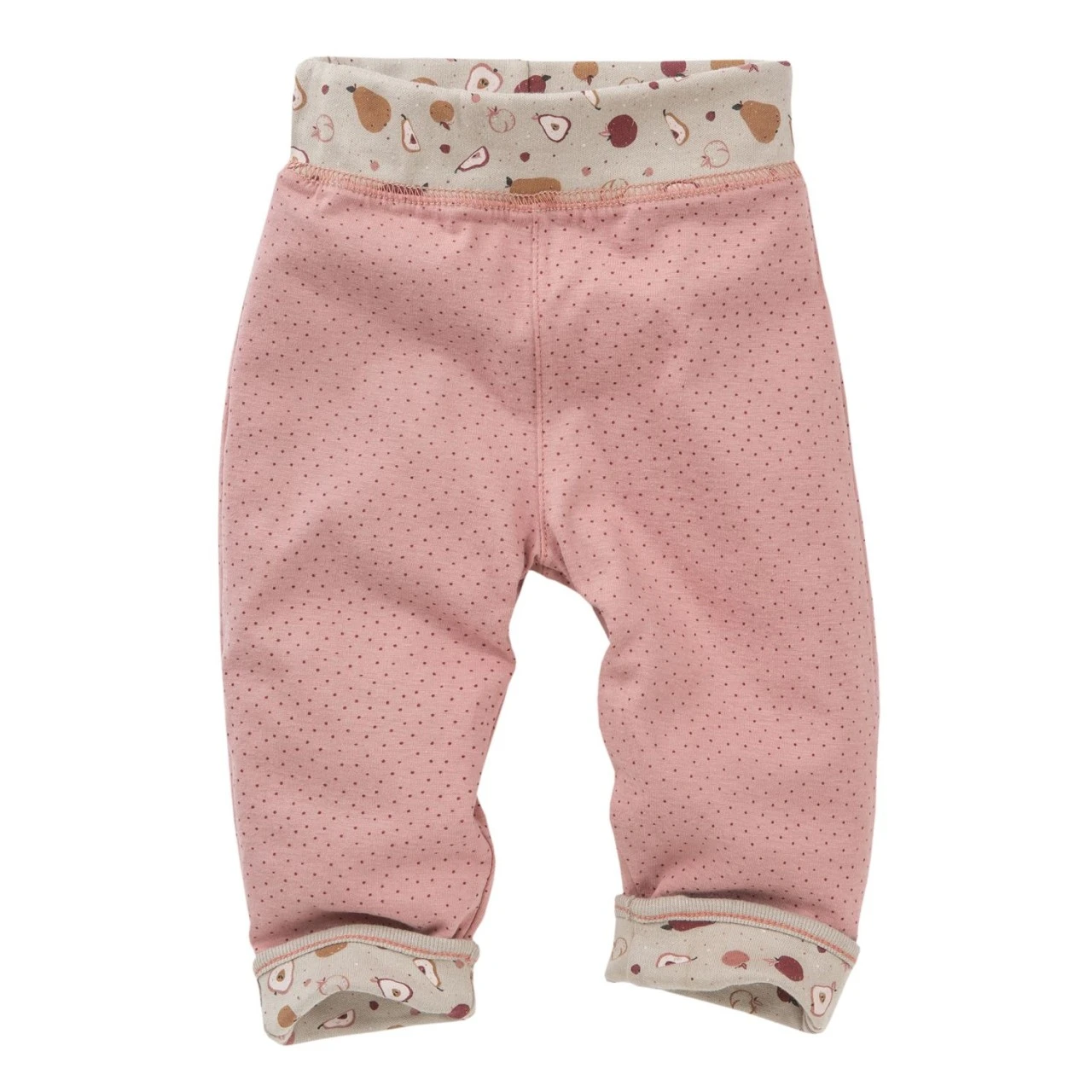 2 Designs, da Modell zum Wenden, eine Seite: All-over-Print „Birnen“ auf grauem Grundstoff, andere Seite zarten Pünktchenprint auf rosa Grundstoff aus kuscheligem Interlock innen und außen angerauht, Umschlag am Fuß als Eyecatcher. 100% Baumwolle aus kontrolliert biologischem Anbau | „organic“ gem. GOTS | zertifiziert durch Ecocert Greenlife, Liz. Nr. 151811