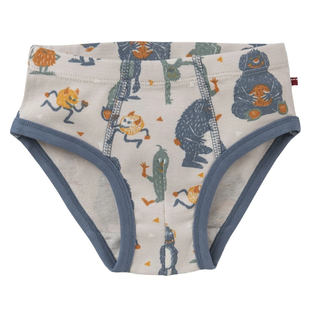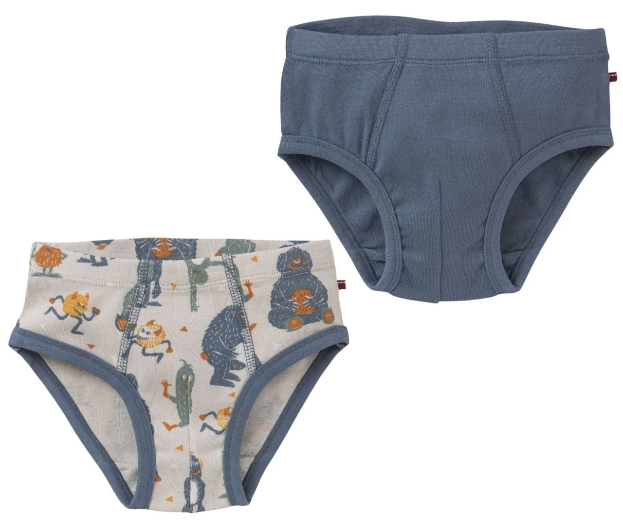 2 bequeme Jungen-Slip Unterhosen aus Biobaumwolle. Der Doppelpack besteht zwei Designs, ein Slip mit All Over Print „Monster“ und farblich abgesetzten Einfass, der andere Slip einfarbig blau. Das Material ist 100% Baumwolle , kontrolliert biologischer Anbau, „organic“ gem. GOTS lizenziert durch Ecocert Greenlife | Liz. Nr. 151811. Hergestellt aus Bio-Baumwolle.
