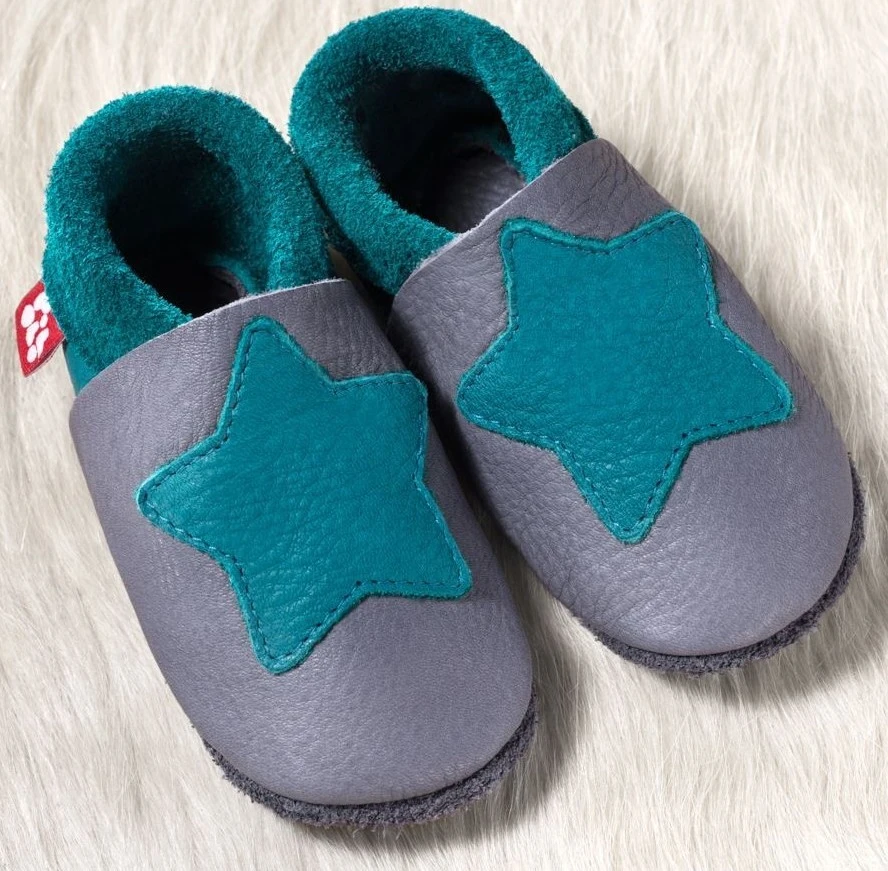 Bequeme Kinderhhauschuhe von Pololo mit hübschem Stern-Motiv. Die Grundfarbe ist graphit grau, der kleine Stern und das Fersenteil sind petrol.. Pololo-Schuhe werden in Deutschland aus pflanzlich gegerbtem Nappaleder hergestellt. Bei der Herstellung und Verarbeitung wird großer Wert auf beste Qualität gelegt und höchste Ansprüche an den Umweltschutz gestellt – kombiniert mit einem Design, das Spaß macht.Wählen Sie die Schuhgröße nicht zu knapp ( mindestens 12 mm länger als der Kinderfuß ) denn Kinderfüße wachsen sehr schnell